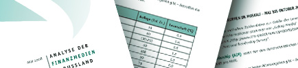 Für ein Rückversicherungsunternehmen erstellte Scio eine aktuelle Analyse der Wirtschaftspresse und der relevanten Medien in Russland. Der Auftrag umfasste Kontaktaufbau zu Redaktionen und Bewertung der individuellen Medien. Das besondere Augenmerk lag auf dem Aspekt der Beziehung zum Versicherungswesen. Die Analyse wurde zusammen mit der Moskauer Staatsuniversität erstellt und gestaltet.